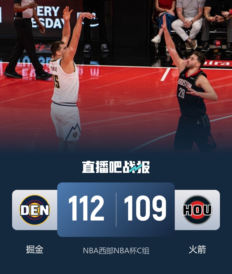 比赛开始,掘金反客为主率先发力,多点开花占据主动,火箭全队慢热,仅靠杜兰特拿分苦苦支撑,戈登伤退,次节掘金命中率下降,谢泼德火力全开,里突外投传射建功,帮助火箭连续打出进攻高潮反超比分,半场打完火箭49-46领先掘金,谢泼德独得20分。易边再战,掘金再度占得先机,约基奇开启进攻模式带队打出11-2的攻击波再获两位数优势,又是谢泼德挺身而出,打成3+1吹响反击号角,火箭多点开花轰出16-2再度反超,末节双方争夺陷入白热化,约基奇和申京先后累计5次犯规,但掘金进攻稳扎稳打逐渐占据主动,关键时刻申京出现失误后又被对方封盖,阿门和小史密斯先后命中三分,约基奇两罚全中后申京超远三分绝平没有。最终,火箭109-112不敌掘金,主场落败。