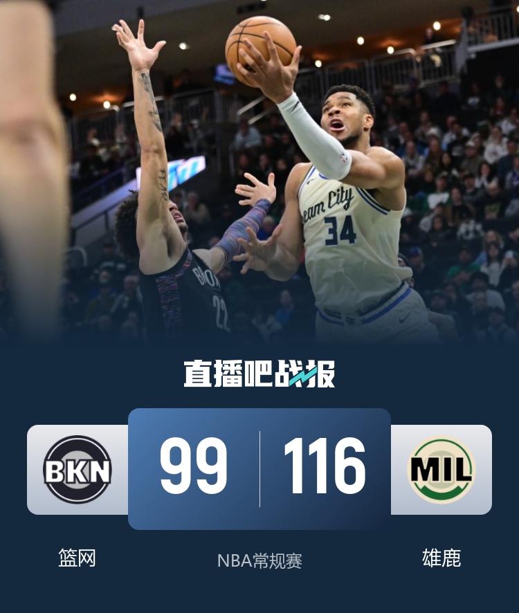 比赛开场,两队先是陷入拉锯战,此后雄鹿打出一波11-0建立领先优势,但篮网还是顽强将比分追回,首节结束雄鹿32-29领先。次节回来,雄鹿攻防两端开始发力打出一波流,领先到两位数,本节雄鹿外线手感火热,以71-53领先结束上半场。易边再战,雄鹿延续攻势,字母哥在篮下予取予求,篮网进攻端则是愈加冷却,分差被拉开到30分上下。末节上来,双方很快换上替补阵容,比赛结果盖棺论定,最终雄鹿116-99大胜篮网,终结七连败。