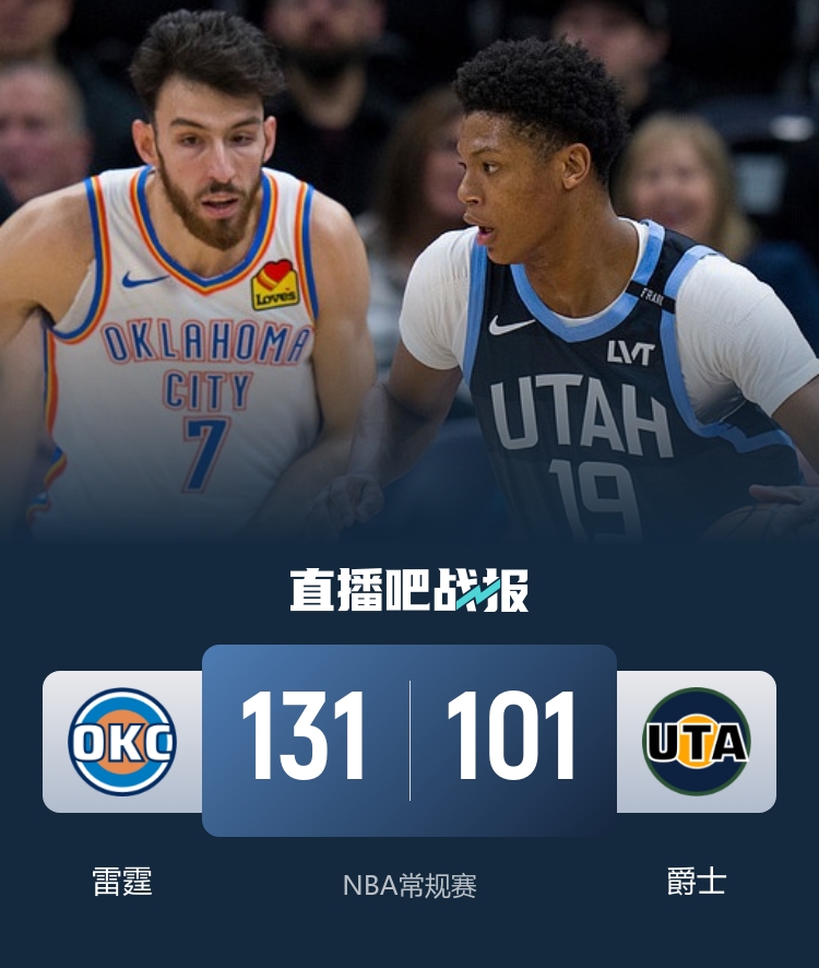 首节对决雷霆虽然缺少亚历山大但攻势依旧强势,他们单节轰进11记破队史记录并爆砍45分,其中替补席砍下26分比爵士首节总分还要高出6分;次节雷霆前期手感回落,这一整节仅命中一记三分,但爵士没能抓住机会,后半段雷霆迅速回暖并拉开26分领先进入下半场。休息归来雷霆继续压制对手不断扩大领先,分差一度拉大至40分以上,比赛也早早就失去悬念。最终,雷霆客场大胜爵士豪取15连胜。