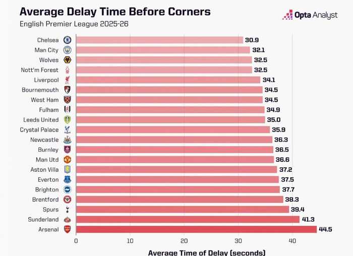 Opta Analyst公布了2025-26赛季英超各队在角球开出前的平均拖延时间。数据显示,阿森纳以44.5秒高居榜首,是本赛季英超目前角球处理最慢的球队。